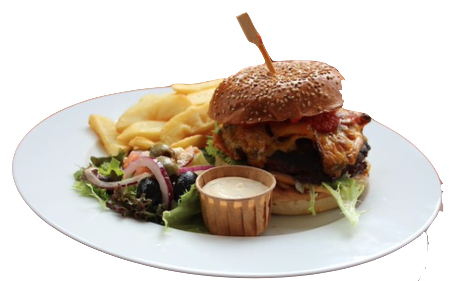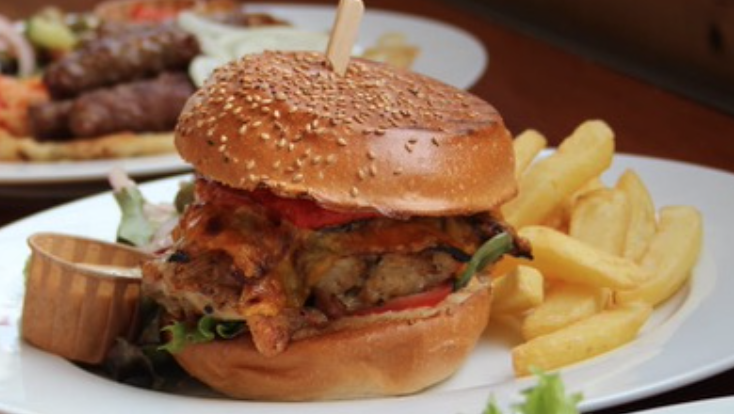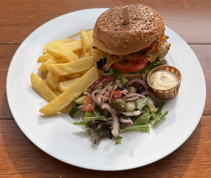 Gegrilde Kippendij Cheese Burger met friet en salade € 16,50