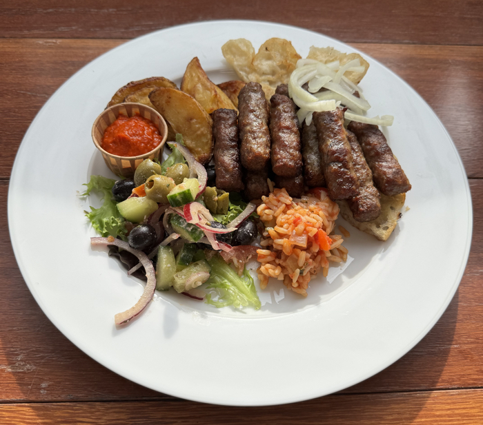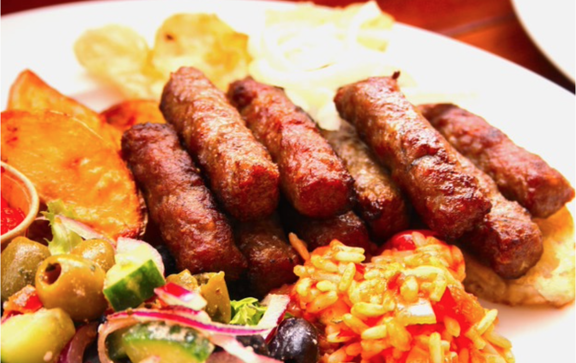 Cevapcici (gekruide gehakt rolletjes ) met aardappeltjes uit de oven, balkan rijst, gegrild brood en salade € 17,50