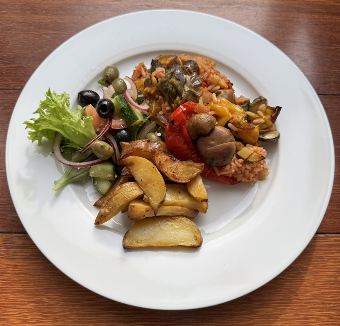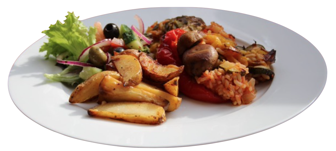 Rijk gevulde paprika met gekruide balkan rijst, groentes, salade, en frietjes of aardappeltjes (vega ) € 15,50