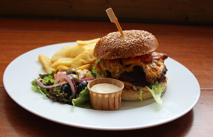 Centrecourt Burger met gegrilde paprika, kaas, gebakken ui, friet en salade € 15,50