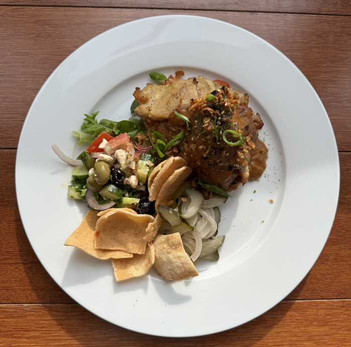 Kipsaté van kippendij met huisgemaakte atjar, friet, kroepoek en salade € 15,50