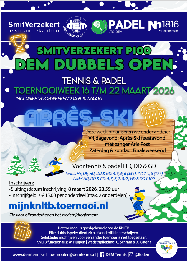 In de 2de helft van maart organiseert DEM altijd het succesvolle DEM Dubbels Open toernooi, het eerste toernooi in de omgeving voor tennis en padel, een prachtige start van het seizoen!