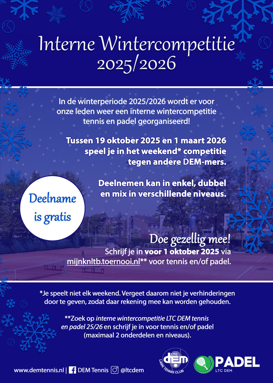 Ook in de winter van 2025/2026 organiseren we weer een Interne Wintercompetitie Tennis én Padel tussen 19 oktober en 1 maart.