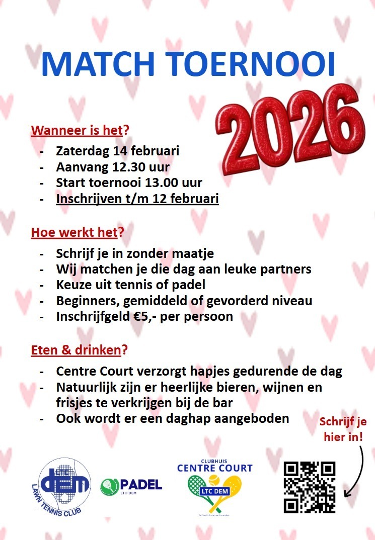 Match Toernooi zaterdag 14 februari 12:30 uur; Tennis en Padel