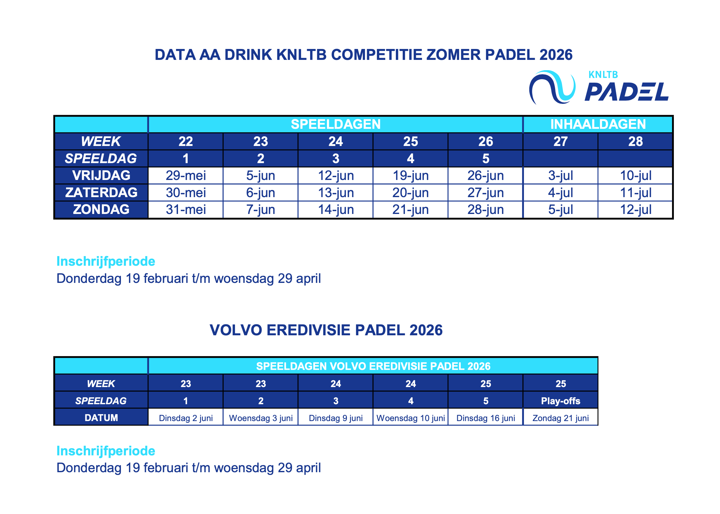 De data van de Voorjaarscompetitie Padel 2026 (zie hierboven), maar ook van de Zomercompetitie Padel 2026 zijn al bekend: